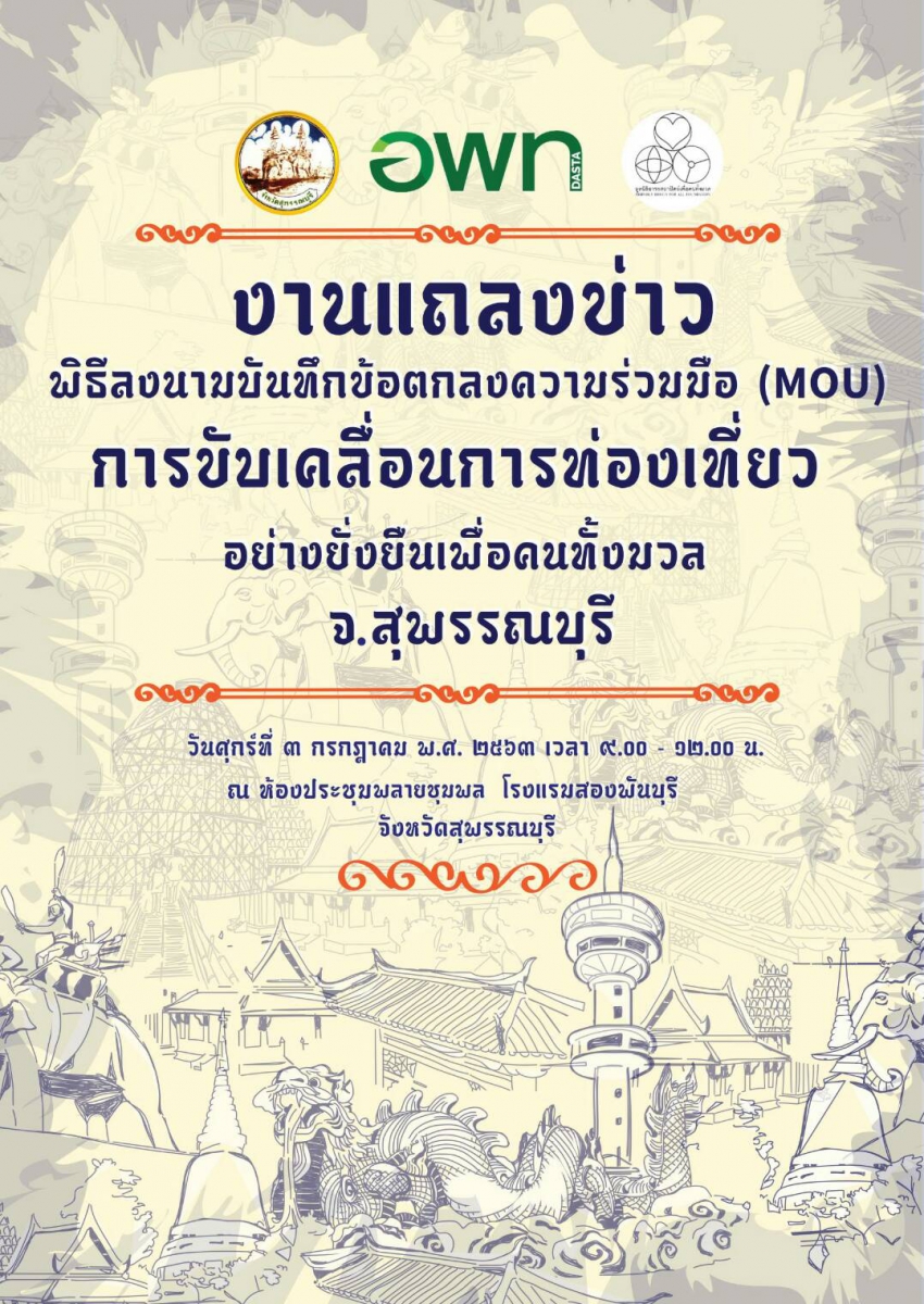 โดยองค์การบริหารการพัฒนาพื้นที่พิเศษเพื่อการท่องเที่ยวอย่างยั่งยืน (องค์การมหาชน) ร่วมกับมูลนิธิอารยสถาปัตย์เพื่อคนทั้งมวล และเครือข่ายพันธมิตรการขับเคลื่อนการท่องเที่ยวอย่างยั่งยืนเพื่อคนทั้งมวล จะได้จัดพิธีลงนามบันทึกข้อตกลงความร่วมมือ (MOU) การขับเคลื่อนการท่องเที่ยวอย่างยั่งยืนเพื่อคนทั้งมวล จังหวัดสุพรรณบุรี
