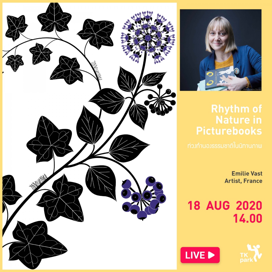 - เอมิลี่ วาส Emilie Vastศิลปิน นักเขียน และนักวาดภาพประกอบ ประเทศฝรั่งเศส ที่จะถ่ายทอดเทคนิคการสร้างสรรค์นิทานภาพทั้งด้านออกแบบลายเส้น สีสัน และกราฟิก ผ่านเรื่องราวของธรรมชาติอันแสนเรียบง่าย แต่เปี่ยมด้วยจินตนาการ โดยจะบรรยายในหัวข้อ “Rhythm of Nature in Picturebooks” ท่วงทำนองธรรมชาติในนิทานภาพ โดยสามารถรับชมหัวข้อนี้ได้ในวันอังคารที่ 18 สิงหาคม 2563 เวลา 14.00 น.